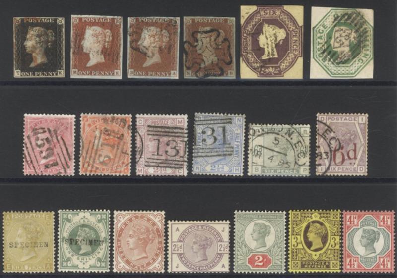 1840-1887 small selection of stamps (19) incl. 1840 1d - sound margins, red MC, 1841 1d (3), 6d & 1s Embossed, a few good U Surface Printed, 9d Spray optd SPECIMEN unused, 1887 1s opts SPECIMEN etc.