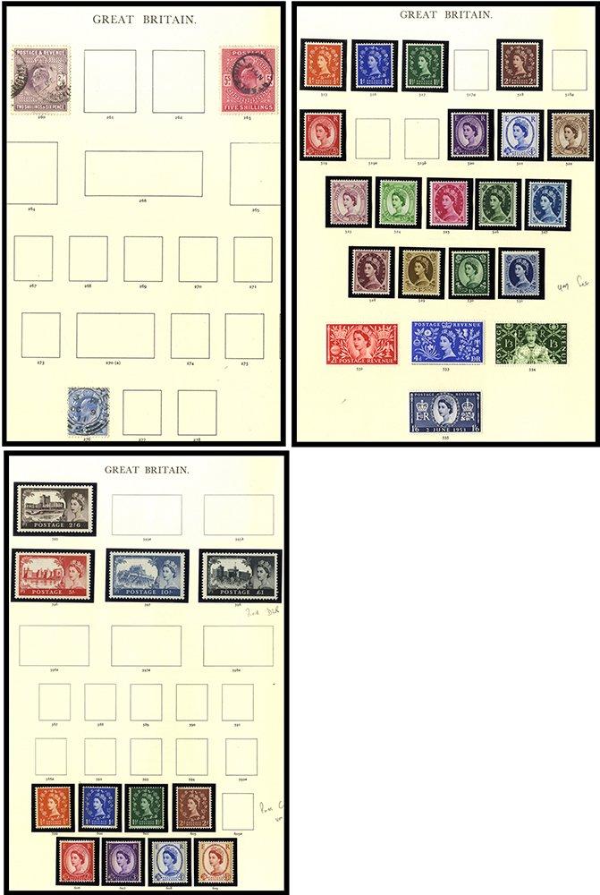 1856-1970 collection on Windsor leaves (360 stamps) incl. 1867 5s Pl.2 U (crease), 1902 2/6d & 5s FU, 1913 2/6d U, 1918 2/6d M & FU, 1952 Tudor set UM, 1955 Waterlow Castle set M (£1 odd short perf), 1959 2nd DLR Castle set UM, commems from 1953 with some phosphor sets incl. 1963 Red Cross UM, 1959