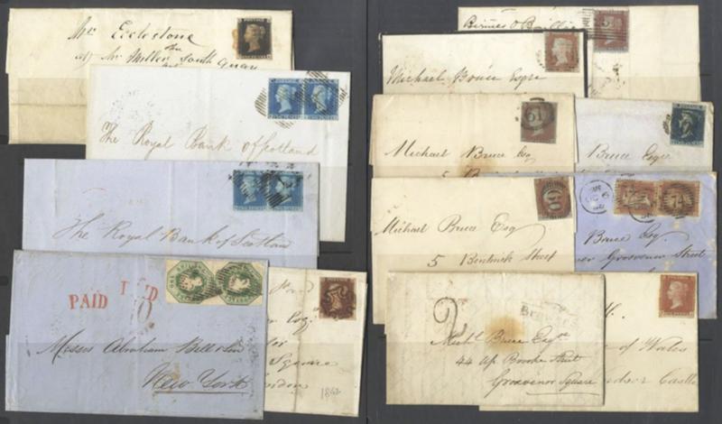 1840-57 LINE ENGRAVED COVERS (11) with four margin 1d black to Great Yarmouth (a little soiled), two covers bearing 1841 2d blue pairs from London to Edinburgh, 1d red imperf covers (4), 1d SG.29 etc. Also 1847 Embossed 1s green in pair on (slightly reduced) cover from Belfast to New York. A useful
