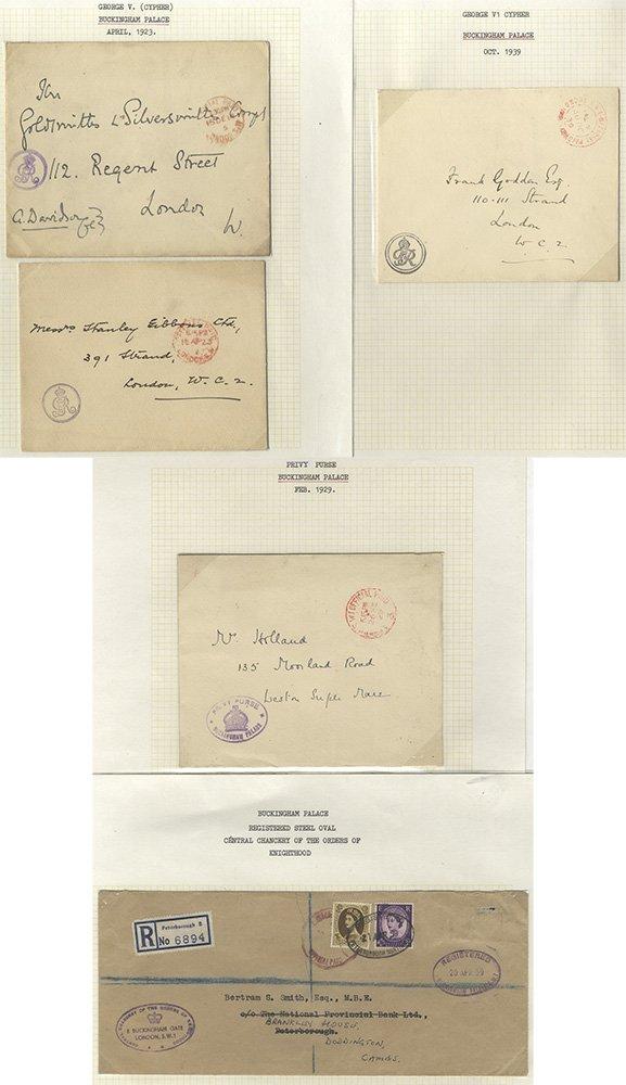 Group of four Official Buckingham Palace covers on leaves, 1914 & 1923 covers with KGV Cypher (2), 1939 KGVI Cypher, 1929 with 'Privy Purse Buckingham Palace' cachet in violet, also 1959 registered with 'Central Chancery of the Orders of Knighthood' cachet. (5)