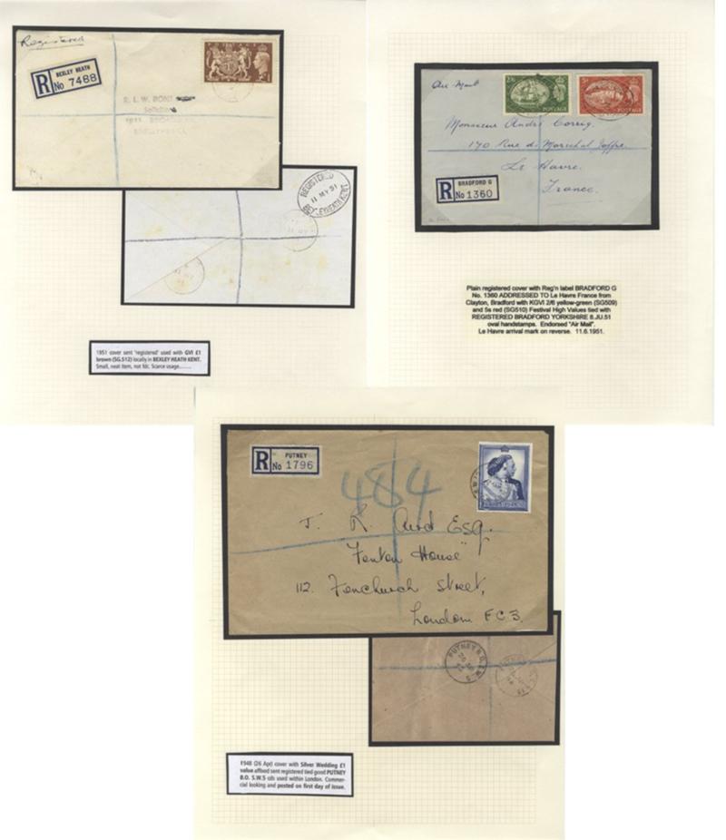 REGISTERED MAIL 1948-51 three items of reg mail 1948 AP.26 local London cover franked £1 Silver Wedding, tied Putney c.d.s. for 26th April - the first day of issue, two other reg covers, first franked 2/6d & 5s Festival, 2nd bears Festival £1. (3)