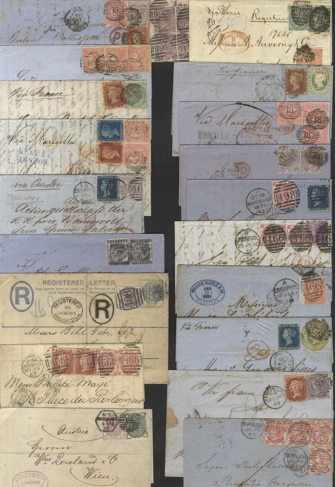 COLLECTION in an album comprising 58 QV (mostly Surface Printed) covers. There are many less common frankings, incl. 1867 6d Pl.6 in block of four to Lima, 1855 4d rose (3) to Naples and pair of 4d + 1d red and 2d blue 'Stars' also to Naples, 1862 3d strip of three + single to Rome, 1855 1s green to
