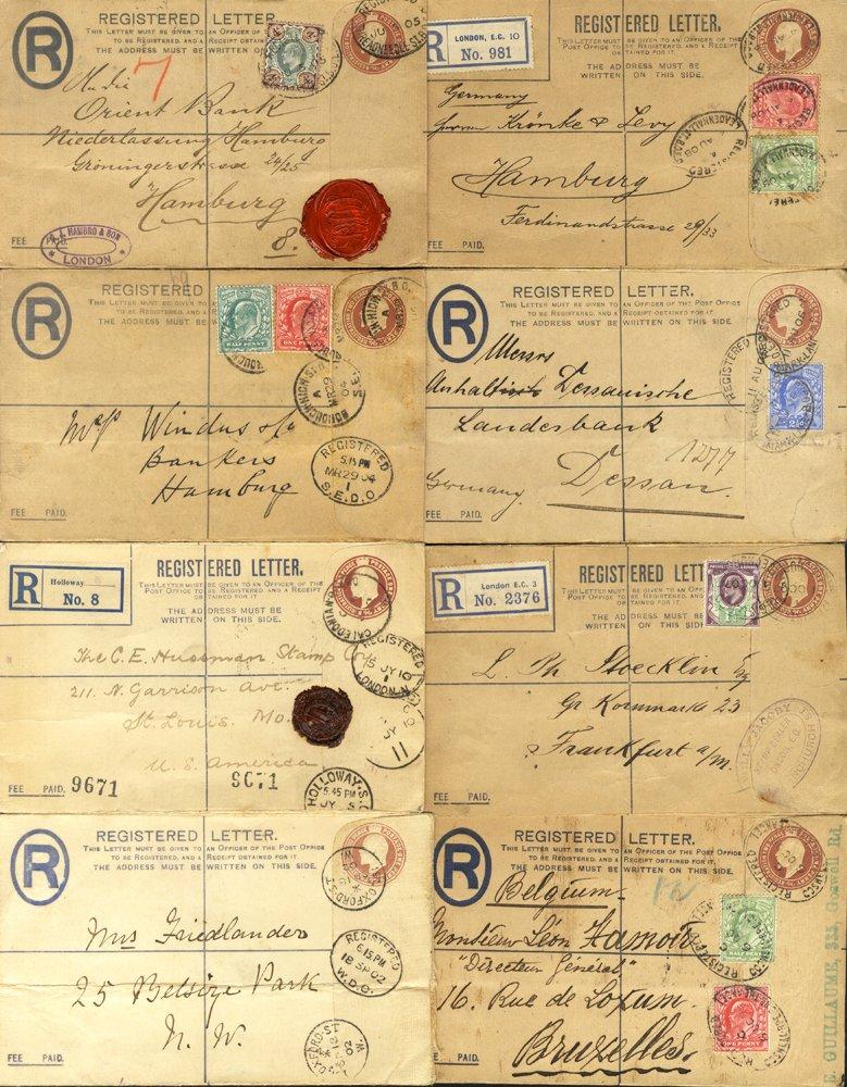 LONDON KEVII postal stationery: Post Office registered envelopes, used mainly to overseas destinations with a variety of sizes, upratings & cancellations with a number of attractive items noted. Well worth inspection. (33)