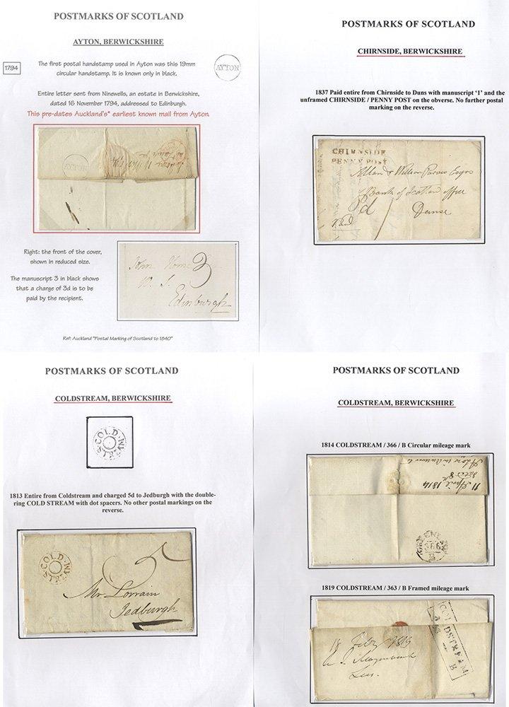 BERWICKSHIRE 1790's onwards collection neatly presented, written up on leaves in protectors in a ring binder. Contains the earliest of all known items of mail cancelled at Ayton, the earliest recorded 40mm Duns/359-B mileage mark etc, several Penny Post and additional halfpenny h/stamps also include