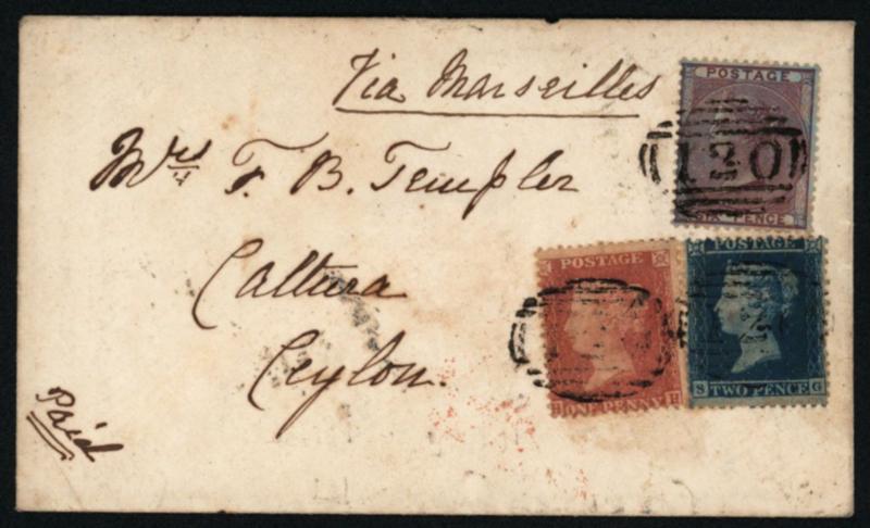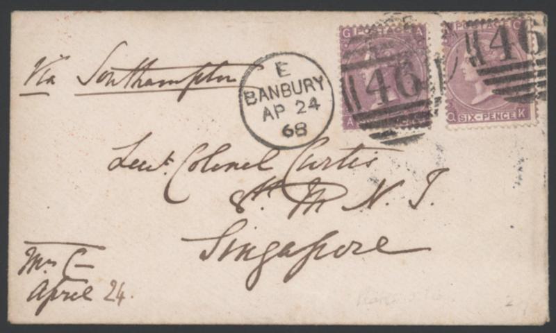 1868 fine envelope sent from Banbury to Lieutenant Colonel Curtis 8th Rgt Madras Native Infantry, Singapore, bearing 6d deep lilac Pl.5 (SG.96) & 6d lilac Pl.6 (SG.104), both neatly tied by Banbury '46' duplexes for AP.24.1868, routed via the cheaper but slower route via Southampton, Alexandria, Sue