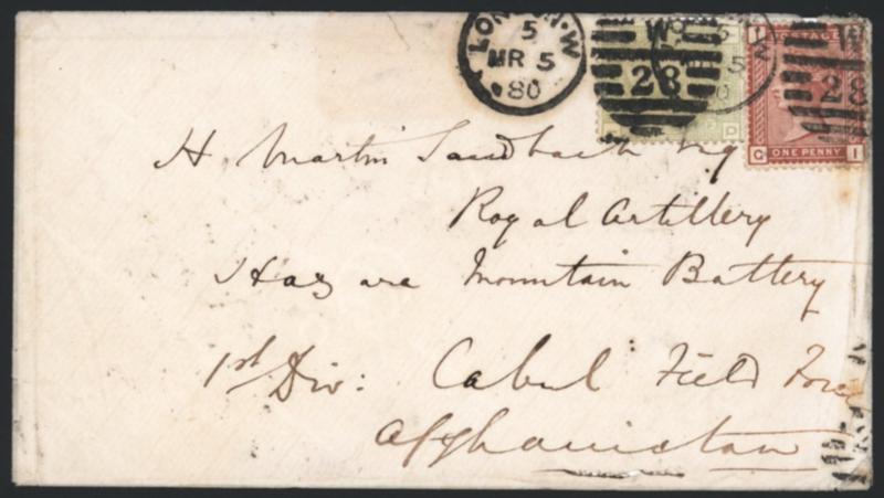1880 (2nd Afghan War) cover from London to a 'H. Martin Sandbach Esq' of the Hazara Mountain Battery, Kabul, address further defined en route by the Army Post Office '1st Div, Field Force, Afghanistan' prepaid at the 5d rate by 4d sage green Pl.16 and 1d Venetian red, both tied by London duplexes fo