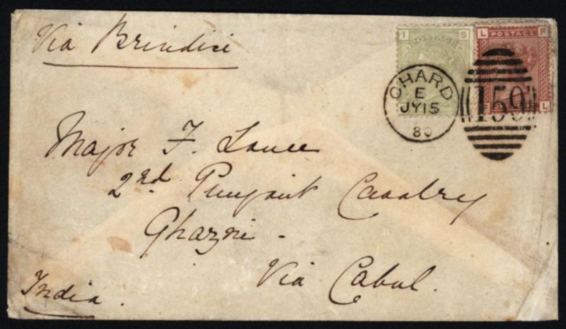 1880 very fine cover to Major F. Lance serving with the 2nd Punjab Cavalry nr Ghuznee, Afghanistan during the 2nd Afghan War. Prepaid at the 5d rate with 4d sage green (SG.156) and a 1d Venetian red, both neatly tied by a crisp Chard '159' duplex for JY.15.1880, b/stamped with 'Sea Post Office' c.d.