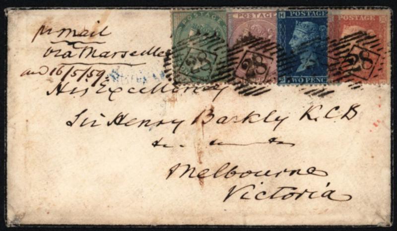 AUSTRALIA 1859 very fine mourning envelope to Melbourne routed via Marseille, prepaid at the 1/9d rate for letters between ½oz-3/4oz, addressed to Sir Henry Barkly K.C.B the appointed Governor of the State of Victoria, Prepaid with 1s green, 6d lilac, 2d blue Pl.7 and a 1d rose red, each stamp neatl