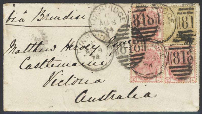 AUSTRALIA 1874 envelope from Tunbridge to Castlemaine, Victoria Via Brindisi, franked 9d straw, SG.110 & 3d rose Pl.14 (3), SG.143, tied Tunbridge duplexes for Aug 15.74, reverse bears Melbourne transit & Victoria receiving marks for Sep 21st. Unusual & scarce franking. Cat. £645.
