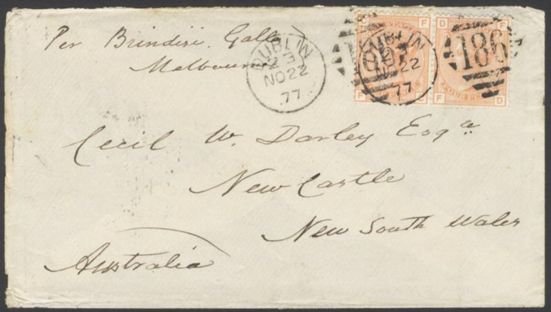 AUSTRALIA 1877 cover from Dublin to Newcastle, N.S.W, franked 4d vermilion Pl.15 horiz pair FC/FD (SG.152), tied Dublin duplexes for NOV.22.77, reverse bears Sydney JAN.7.78 d/stamp & Newcastle N.S.W receiver for JAN.8. Scarce franking. Cat. £1400+