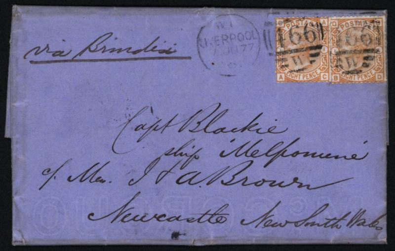 AUSTRALIA 1877 entire letter from Liverpool to Newcastle, NSW, addressed to Capt Blackie, ship 'Melpomene' endorsed at upper left 'via Brindisi' franked 8d orange (2) SG.156, tied by Liverpool duplexes, reverse bears Sydney transit & Newcastle arrival marks.