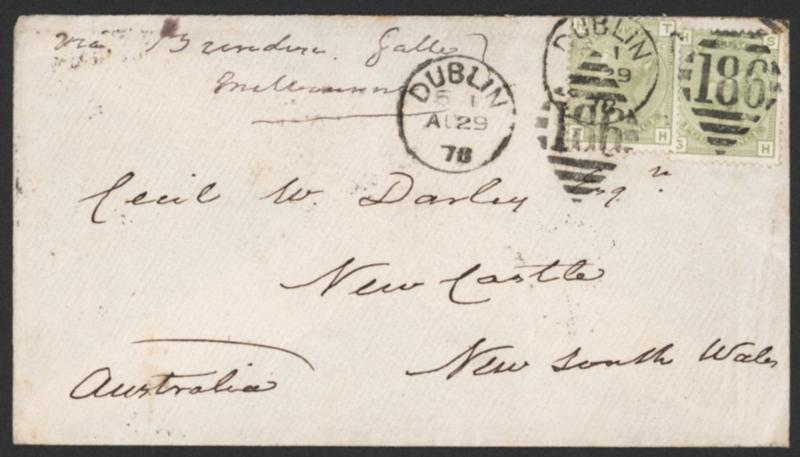 AUSTRALIA 1878 cover from Dublin to Newcastle, N.S.W, franked 4d sage green Pl.15 (2), tied by fine Dublin duplexes for AUG.29.78, reverse bears Sydney transit for Oct 11th & Newcastle arrival for 12th.
