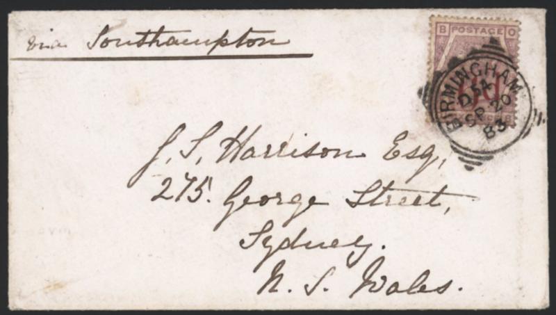 AUSTRALIA 1883 envelope from Birmingham to Sydney, N.S.W franked 6d on 6d lilac (SG.162) tied by very fine Birmingham squared circle for SP.20.83, reverse bears Sydney receiver for Nov 17th, fine uncreased cover.