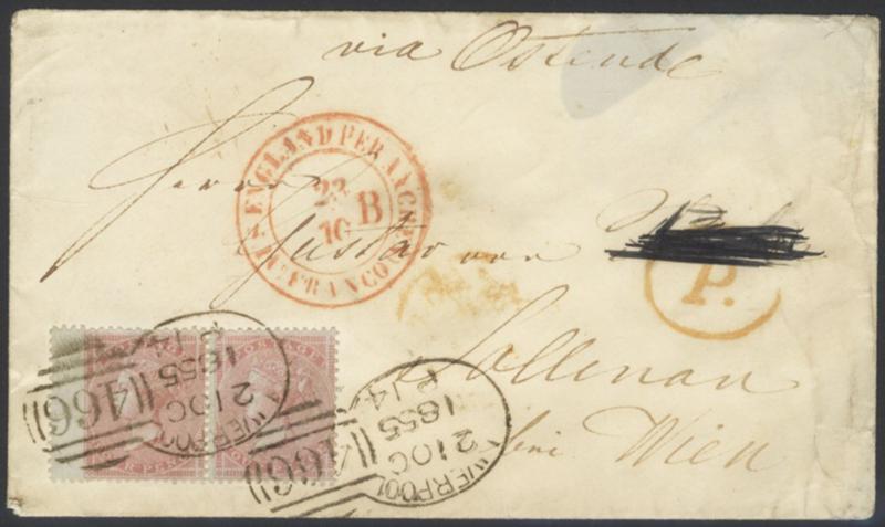 AUSTRIA 1855 Oct cover from Liverpool to Vienna, franked 4d carmine Wmk Small Garter, SG.62, fine wing margin horiz pair, tied by very fine Liverpool spoon duplexes for 21.OCT.1855, obverse endorsed Via Ostende, reverse bears indistinct marks of transit or receiver. Scarce franking. Cat. £900++
