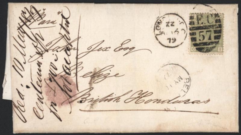 BRITISH HONDURAS 1879 cover from London to Belize, British Honduras, franked 4d sage green Pl.16 lett GI (SG.153), tied London duplex JAN.16.79, underneath a strike of the Belize receiving c.d.s. for MAY.10.79. Scarce franking & unusual condition.