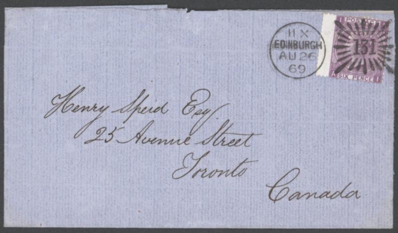 CANADA 1869 fine single rate cover to Toronto pre-paid with 6d mauve Pl.8 (SG.109) neatly tied by a superb Edinburgh '131' Brunswick Star type duplex for AUG.26.1869, Toronto receiving c.d.s. on reverse for SP.7.69.