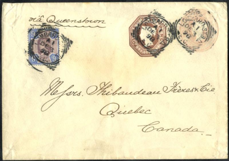 CANADA 1898 S.T.O 1d + 10d stationery envelope uprated with 9d Jubilee to Quebec, tied Lombard St. DE.3.98 squared circles, reverse: Quebec receiver for Dec 12.