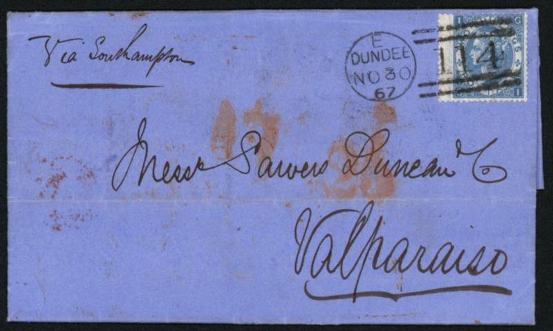 CHILE 1867 entire letter from Dundee to Valparaiso, franked 2s blue GI (SG.118) left wing margin, tied by a fine Dundee duplex NO.30.67, endorsed Via Southampton, reverse shows London transit mark for Dec 2nd. Scarce franking, BPA Cert. 1987. Cat. £700