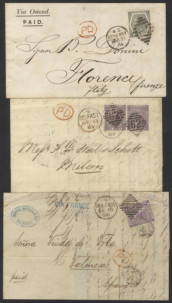 EUROPE 1864-74 covers (3) from Belfast. 1864 to Valencia, 1865 to Milan & 1874 to Florence, each with 6d frankings incl. pair, all tied BELFAST duplexes, reverses bear appropriate transit & receiving marks. (3)