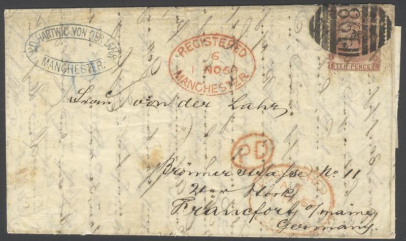 GERMANY 1869 entire letter from Manchester to Frankfurt, franked 10d red brown (SG.112), tied barred oval numeral '498' of Manchester, obverse bears oval reg d/stamps in red for Manchester & London, both dated 1st Nov, also company oval h/stamp of J.D HARTWIG VON DER LAUR, reverse bears Frankfurt re