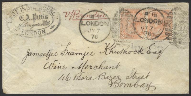 INDIA 1876 cover from London to Bombay franked 4d vermilion Pl.15 horiz pair OJ/OK (SG.152) tied London duplexes for July.7.76, obverse bears C. A. Pittis East India Agency London oval cachet, endorsed 'Via Brindisi,' reverse 'SEA/POST OFFICE 14 JUL,' scarce franking. Cat. £1575.