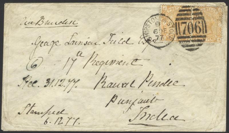 INDIA 1877 cover from Shipston Stour to Rawal Pindi franked 8d orange pair, SG.156, tied Shipton Stour duplex for 6.DEC.77, reverse with SEA/P.O.DEC 14 d/stamp & receiver of Rawal Pindi. Cat. £715