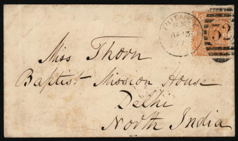 INDIA 1877 envelope from London to Delhi, franked 8d orange AE (SG.156), tied by a very fine Putney duplex for AP.13.77, reverse bears 'Sea/Post Office/F/APR.20' d/stamp & Delhi receiver for May 6th. Fine uncreased cover. (1) Cat. £625
