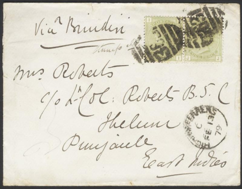 INDIA 1879 envelope from Higham Ferres to Jhelum, Punjab, franked by 4d sage green pair Pl.15 (SG.153), tied barred oval numerals '363' obverse bears Higham Ferres c.d.s. for FE.13.79, reverse bears SEA/P.O c.d.s. for FEB.21 & JHELUM c.d.s. for March 10th. Scarce franking. Cat. £770+