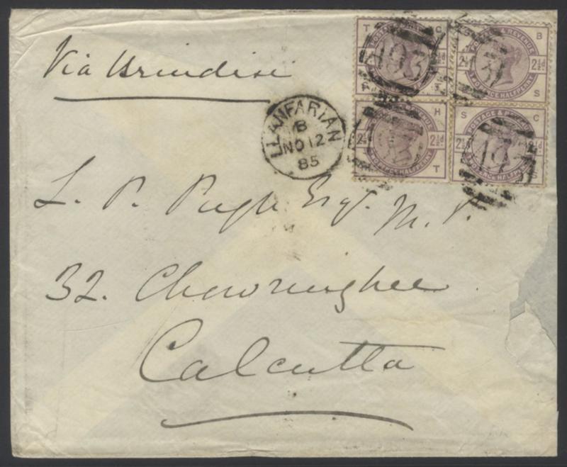 INDIA 1885 envelope (torn at lower right side) from Llanfarian to Calcutta, franked 2½d lilac (two vertical pairs), SG.190, tied by barred oval 'A93' mail boat cancels, with 'Llanfarian c.d.s alongside for NOV.12.85, reverse bears SEA/P.O 21 NOV & Calcutta receiver for 5.DEC.85.