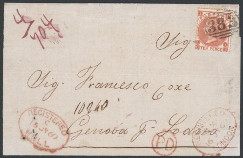 ITALY 1869 registered from Hull to Genoa, franked 10d red brown (SG.112) tied barred oval numeral '383' of Hull, obverse bears registered oval d/stamp of Hull & London for 15th & 16th July 1869 & 'PD' in circle, all in red, reverse bears transit & receiver d/stamps.