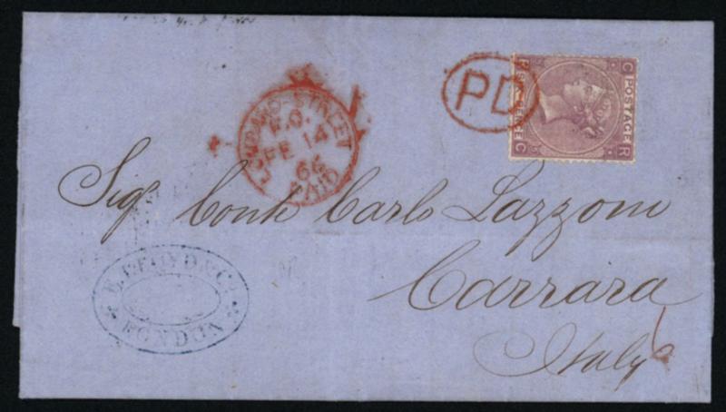 ITALY 1866 very fine and fresh entire to Carrara, franked 6d lilac (with hyphen) Pl.5 lett RC (SG.97) solely cancelled by crisp red oval 'PD' with Lombard St despatch alongside for FE.14.1866, b/stamped by a Torino transit c.d.s. for Feb.17.1866 & Carrara arrival c.d.s. for Feb.18.1866. Spectacular