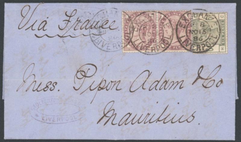 MAURITIUS 1886 entire letter from Liverpool to Mauritius, franked 1d lilac pair and 6d dull green (SG.172 & 194), tied by Liverpool Exchange NOV.15.86 double ring c.d.s's, reverse with arrival c.d.s for DEC.9.88. Attractive cover, scarce destination. (1)
