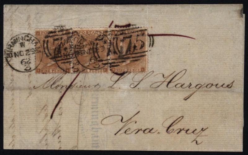 MEXICO 1862 cover from Birmingham to Vera Cruz, franked by 9d bistre strip of three SJ/SL (SG.86), tied by Birmingham duplexes for NOV.29.62, manuscript charge under stamps has been altered from 2/8 to 2/3, reverse bears London transit for DEC.1.62. Rare franking, Cat. £1850, RPS. Cert. 2003. (1)