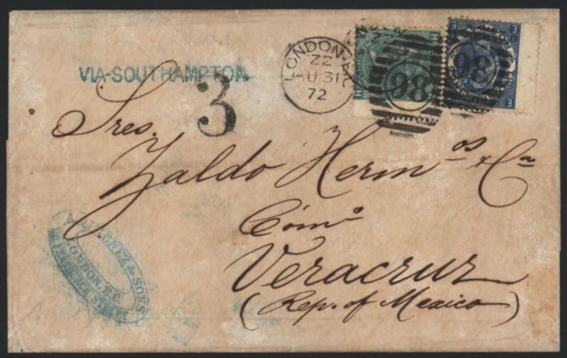 MEXICO 1872 entire to Vera Cruz, franked 1s green Pl.6 (SG.117) & 2c blue (SG.118), both stamps are wing margin examples, tied by London duplexes for JAN.31.72 alongside h/stamp in blue 'VIA SOUTHAMPTON' & hand struck '3' in black. Attractive scarce franking.
