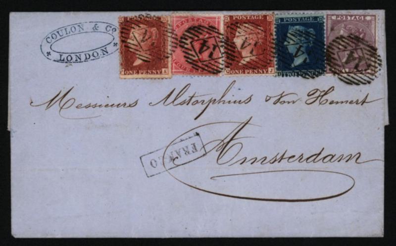 NETHERLANDS superb entire sent from London to Amsterdam bearing two 1d rose reds (SG.40), 2d Pl.6 (SG.35), 4d rose (SG.66a) and a 6d deep lilac (SG.69), each neatly cancelled by a London City '14' numeral with a boxed 'FRANCO' h/stamp below. B/stamped by a London crowned double ring dispatch c.d.s.