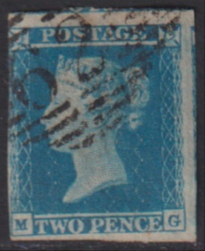 1841-51 2d blue (white lines added), blued paper, strong "Ivory Head", (3 large margins, 4th close). SG 14c. Cat £110. FU.