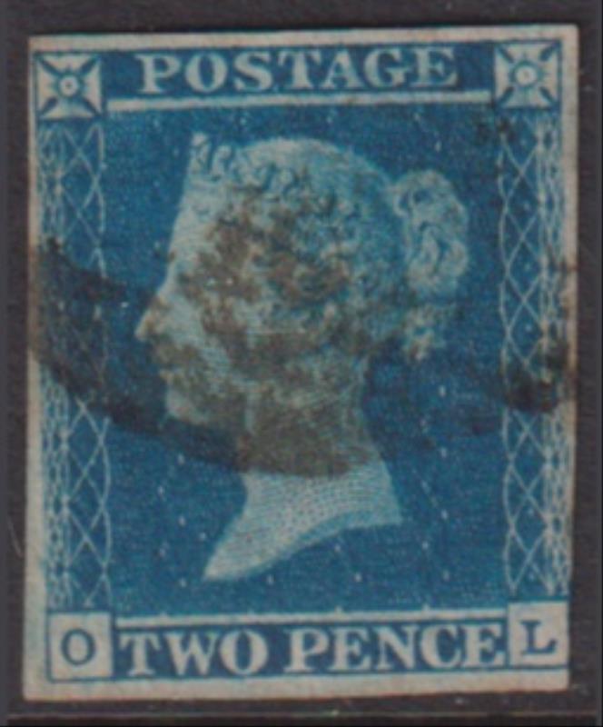 1841 2d deep full blue (OL), with white lines, imperf almost 4 margins (just touched lower RH corner). SG 15. Cat £120. GU.