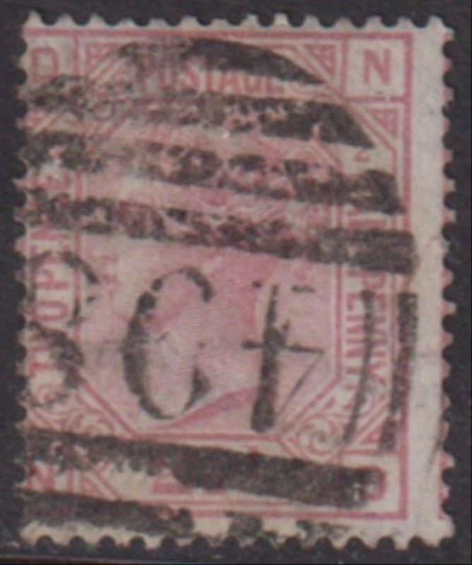 1870-79 ½d rose, plate 13. Vert pair canc complete "805" obliterator. Upper stamp with 3 trimmed perfs. SG 49. Cat £24. GU.
