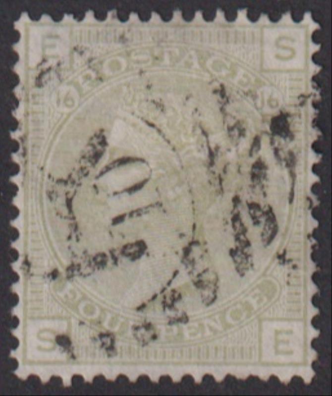 1877 4d sage-green, plate 16, large garter wmk. SG 153. Cat £225. GU.