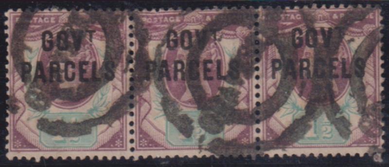 1887 1½d dull purple & pale green, "GOVT PARCELS" ovpt horiz strip of 3, parcel pmks. SG O65. Cat £36. GU.