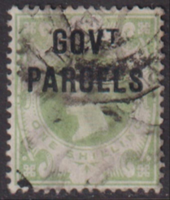 1890 1/- green "Govt Parcels" ovpt, rather faded colour, minor faults, parcel pmk. SG O68. Cat £150. GU.