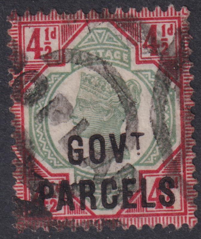 1892 4½d "GOVT PARCELS" ovpt, green colour faded, heavy purple cancel. SG O71. Cat £180. GU.