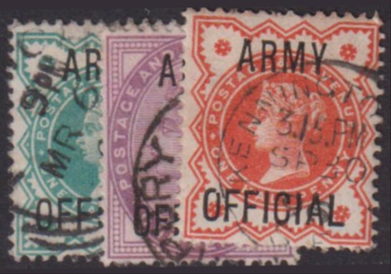 1896-1900 ½d vermilion, ½d blue-green & 1d lilac, "ARMY OFFICIAL" ovpts. SG O41-3. Cat £7. FU.