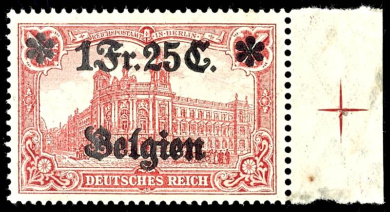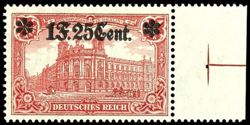 1 F. 25 cent on 1 Mark, stamp from right margin of sheet mint never hinged, very fine, Michel 150.- (11IB) 1 F.25 Cent auf 1 Mark, Marke vom rechten Bogenrand postfrisch, tadellose Erhaltung, Mi. 150.-