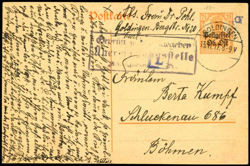 7 1 / 2 pfennigs postal stationery postcard from Gold gene 13.11.17 to Schluckenau in Bohemia, on face violet framed three line censorship stamp, expertized Wasels BPP 7 1/2 Pfennig Ganzsachenkarte von GOLDINGEN 13.11.17 nach Schluckenau in Böhmen, vorderseitig violetter Zensur-Ra3, geprüft Wasel