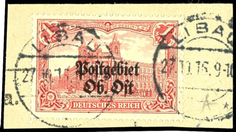 1 Mark German Reich with overprint "postal area whether. east", 26 : 17 perforation holes, used, "LIBAU 27.10.16 9-10 V" on piece, very fine, photo expertize Berend Hey BPP "in faultless, used condition. " , " Michel 230.- " , (12A) (page)