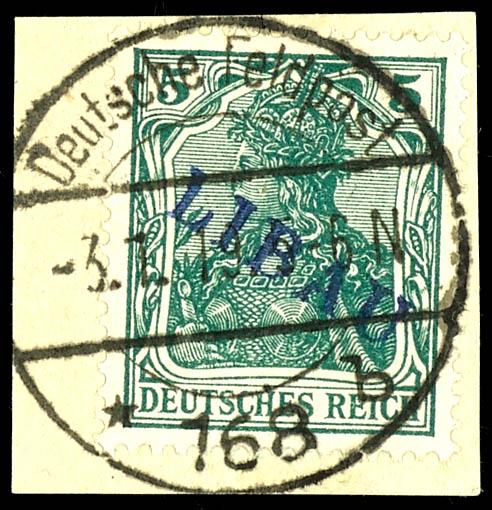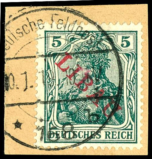 5 pfennigs Germania dark bluish green with violet blue overprint "LIBAU" in type II, used "German army postal service * 168 b 3.1.19" on piece, very fine, expertized Schlegel A. BPP, Michel 150.- (1Ba) 5 Pfennig Germania dunkelbläulichgrün mit violettblauem Aufdruck "LIBAU" in Type II, gestempelt