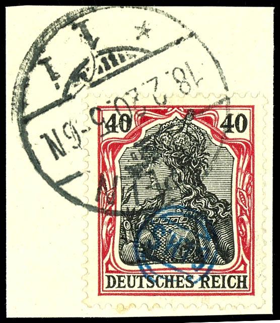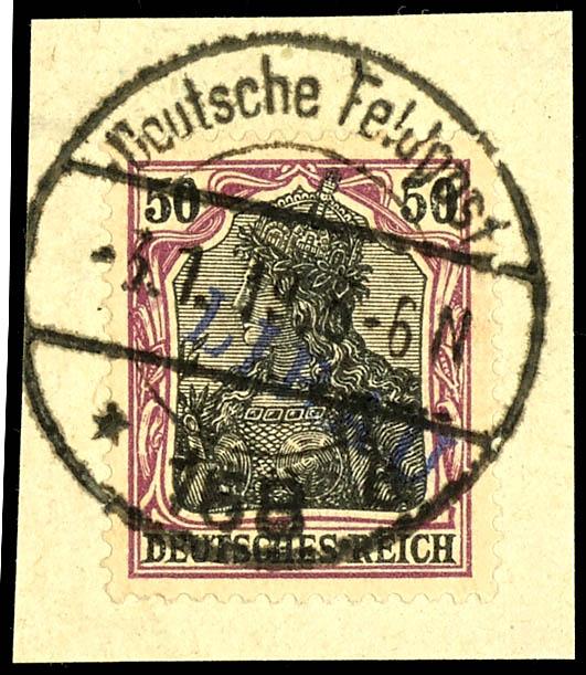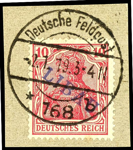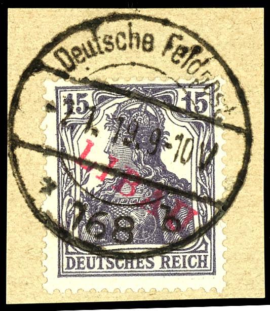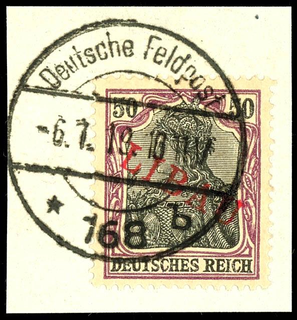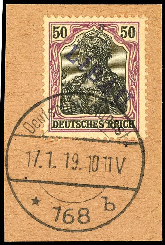 50 pfennigs Germania dark gray purple / black with red overprint "LIBAU" in type II, used "K. D. fieldpost station office * * 168 b -6.1.19 10-11 V" on piece, issued only 200 examples, expertized Schlegel A. BPP, Michel 400.- (6Bb) 50 Pfennig Germania dunkelgraulila/schwarz mit rotem Aufdruck "LI