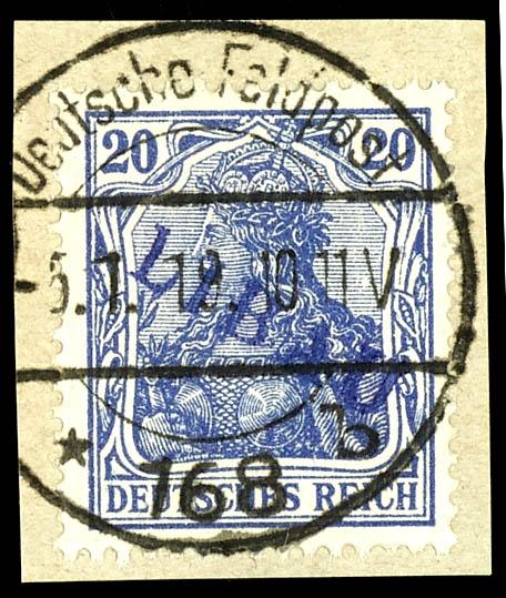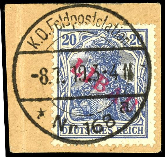 20 pfennigs Germania dark violet blue with red overprint "LIBAU" in type II, used "German army postal service * 168 b -8.1.19" on piece, sound condition, issued only 500 piece, expertized Schlegel A. BPP, Michel 80.- (4Bb/b) 20 Pfennig Germania dunkelviolettblau mit rotem Aufdruck "LIBAU" in Type