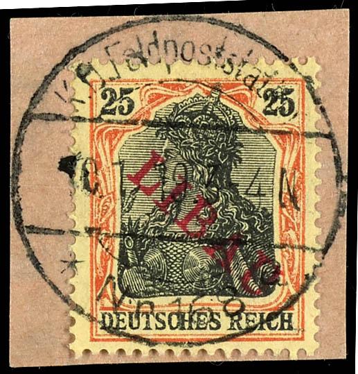 25 pfennigs Germania red orange / black on yellow white with red overprint "LIBAU" in type II, used "K. D. fieldpost station office * a number 168 6.1.19" on piece, issued only 300 examples, signed Kosack, expertise Thilo Nagler VP (2025), Michel 400.- (5Bb) (page)
